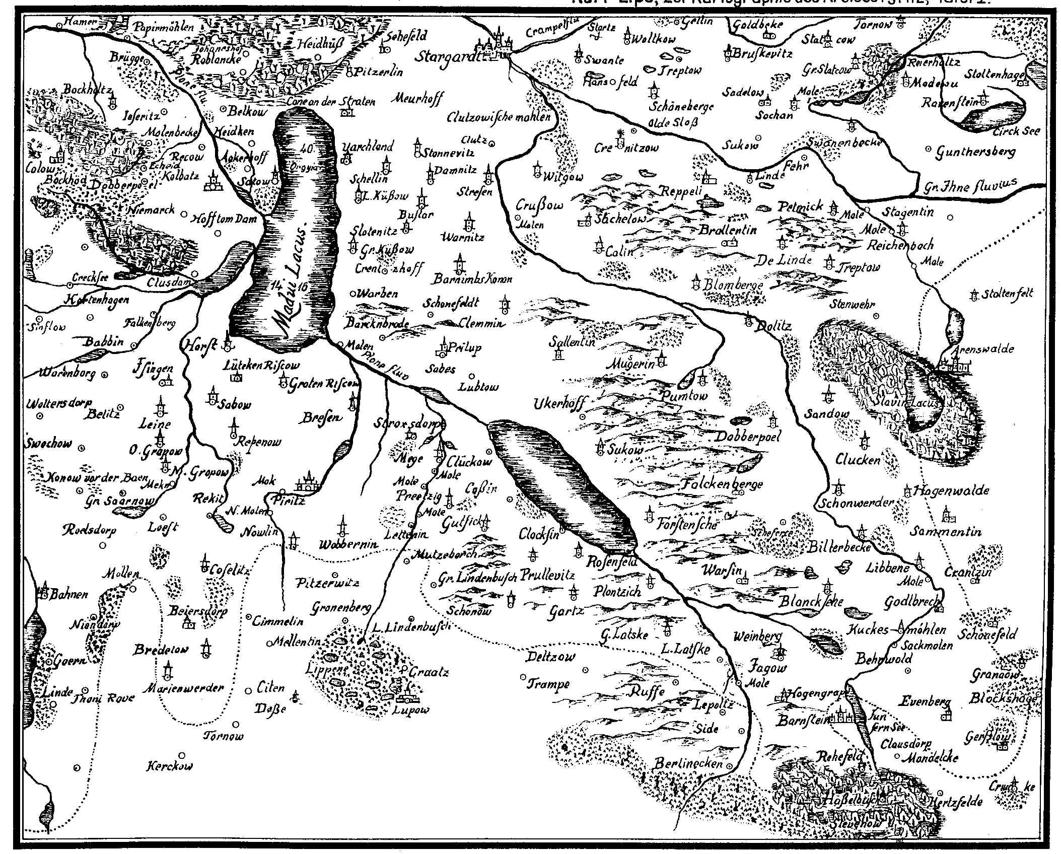 Im Pommerschen Landesmuseum in Greifswald ist die Karte im Großformat zu sehen. Der hier dargestellte Ausschnitt zeigt den Kreis Pyritz, damit aber gleichzeitig wesentliche Teile der Umgebung Stargard's. Beim Madüsee ist zu beachten, dass der heutige Wasserstand und damit die heutige Form erst durch Meliorationen von 1770 erreicht wurden, als durch das Absenken des Sees 8500 ha Land für 150 Familien gewonnen wurde.